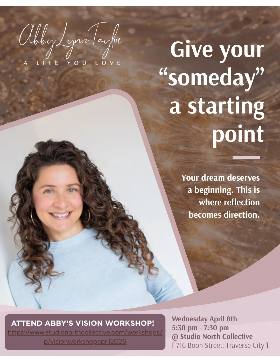 Abby Taylor is hosting a Vision Workshop on April 8 at Studio North Collective. It’s a complimentary interactive workshop that touches on mindset, increasing awareness, and success principles. We do a visioning activity that gives people an opportunity to dream and think about what they would love in their lives. Then I offer some principles and practical steps one can take to move towards that dream. Let me know if you have questions.