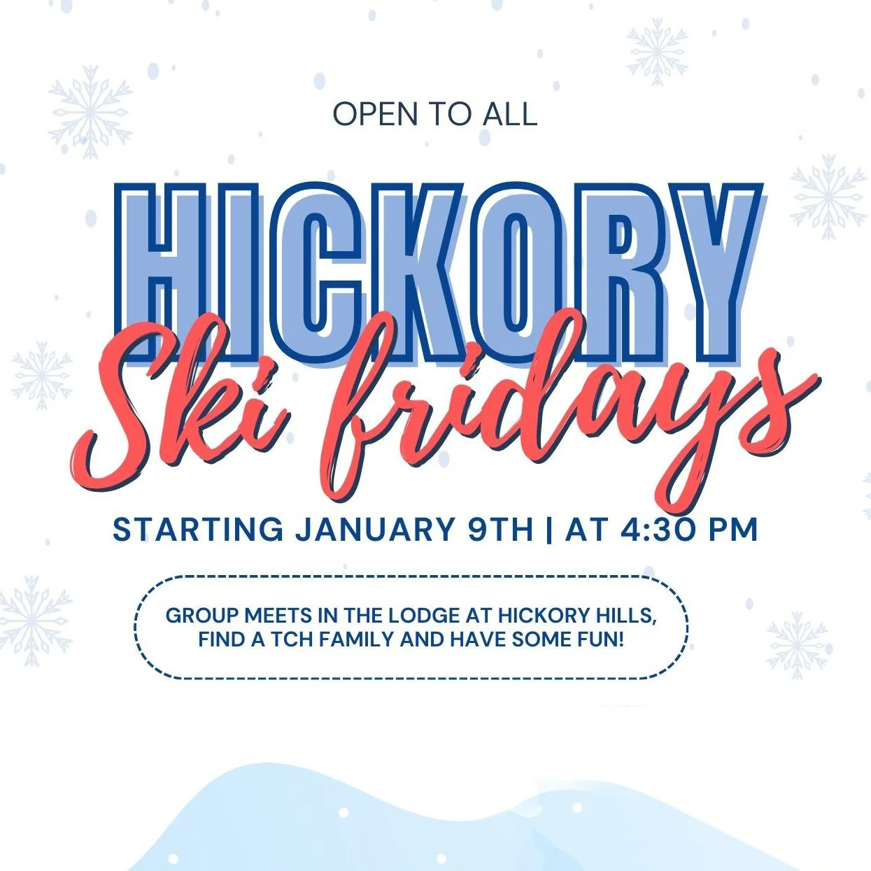 Tired of looking for activities during the winter for your kiddos? Want to get outside with other TCH families and enjoy the snow? This is a chance for your kiddos to ski or snowboard, connect with other TCH families, eat some food, and celebrate the end of the week.